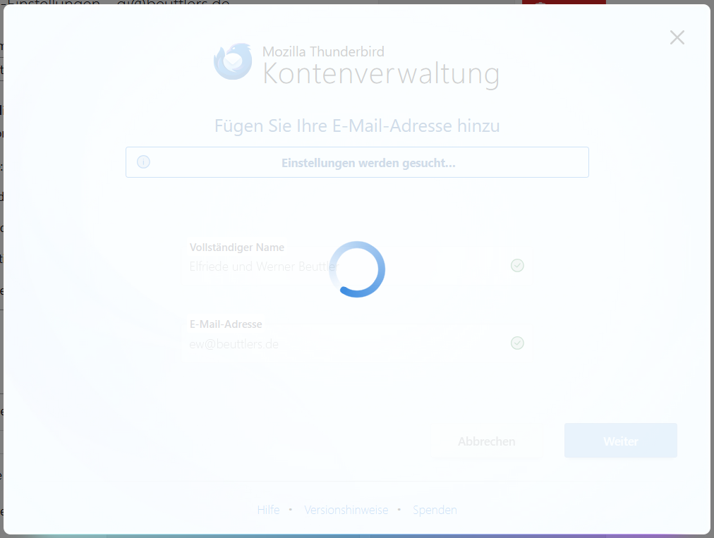 Hello, I'm using Thunderbird version 140.2.1esr (64-bit). I want to create a new account with a different email address. In the first dialog, I'm asked for my "Full Name" and "Email Address." After that, I only have the option to click "Continue." Thunderbird then crashes, and even after several minutes, it doesn't continue. I've attached a screenshot. Creating multiple accounts is actually quite common for me; I've done it several times in the past with previous versions of Thunderbird without any problems. Thank you for your support. Regards, Jürgen