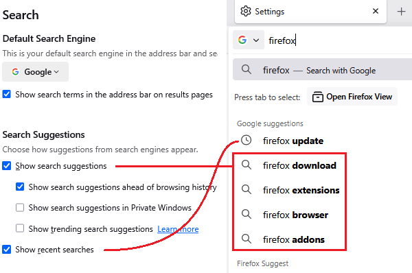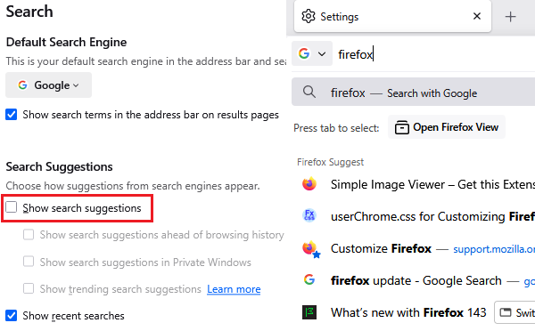 I have unchecked search suggestions in settings but these still appear when I search in Firefox with Google (for which I have disabled trending searches).