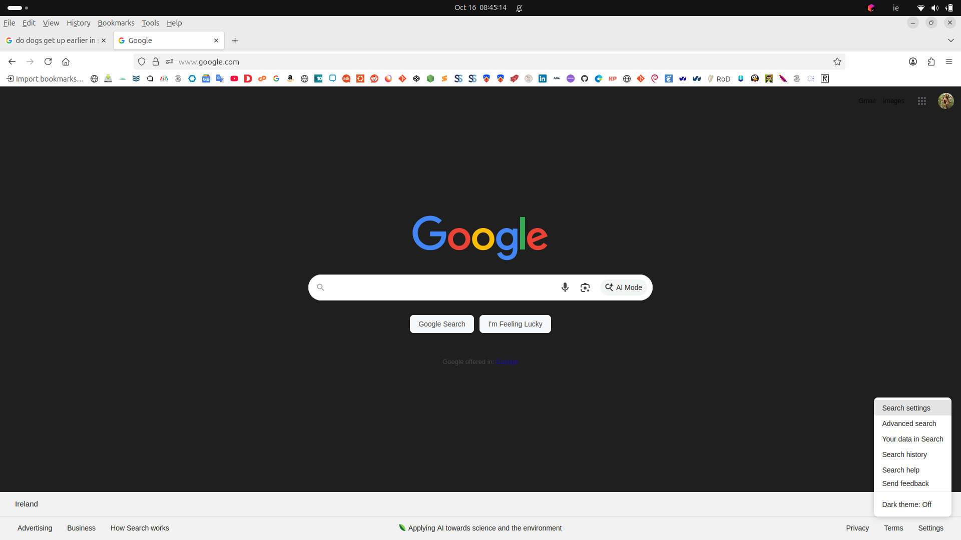 Yesterday I switched on my PC, opened Firefox and the home page was black. See the attached screenshot. This is not caused by some accidental switching on of the dark mode. Dark mode is clearly off. Neither can I adjust settings to make the Google home page revert to its customary light grey shade.