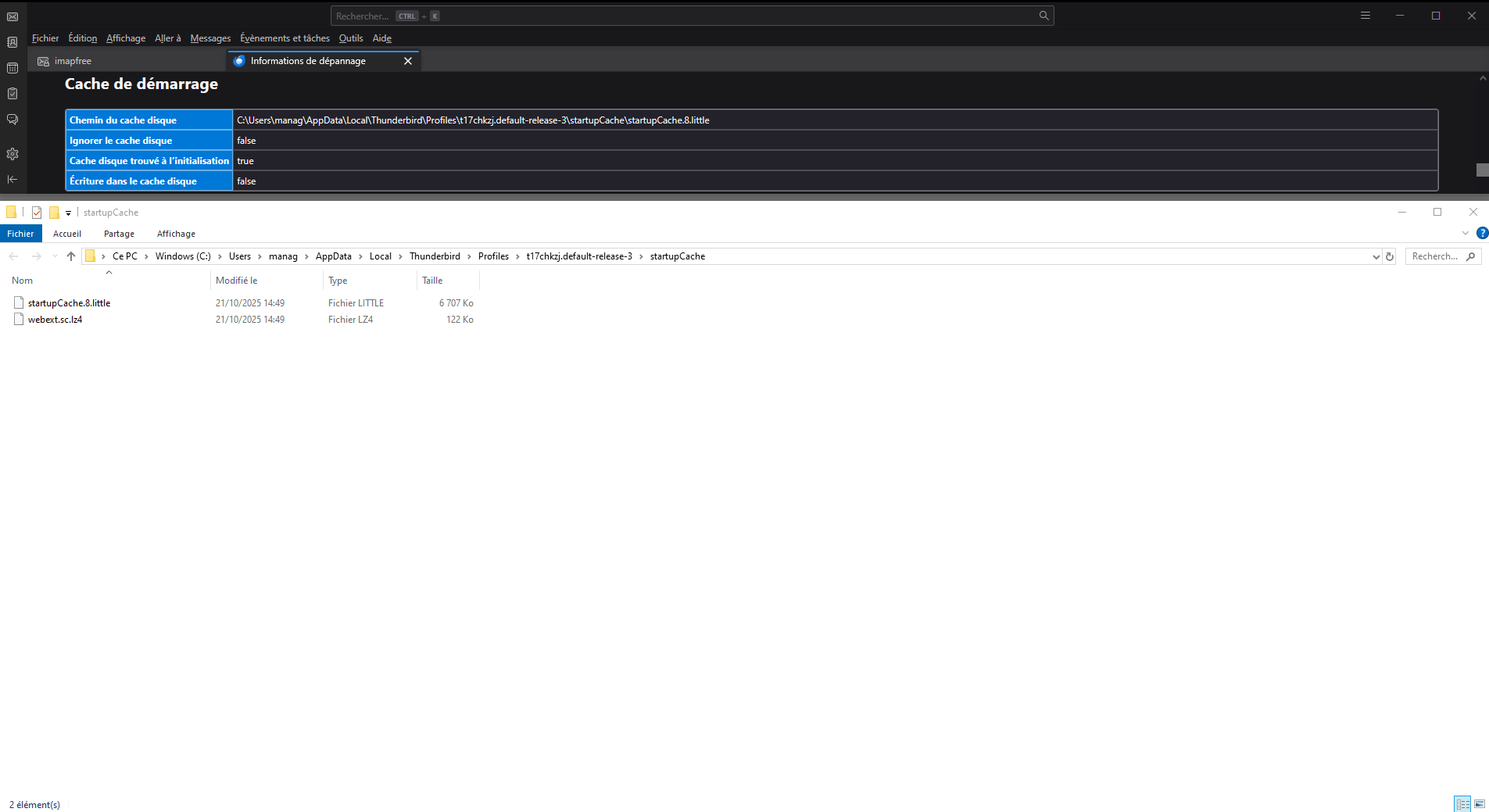 About, Clear startup cache. (screenshot2) Cache de démarrage Go to your folder startupCache. Stop Thunderbird. Delete content of folder startupCache. Start Thunderbird.