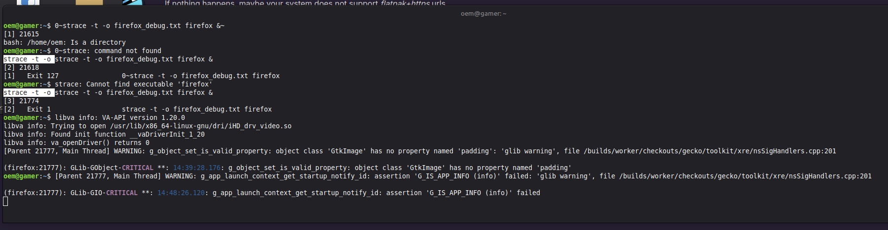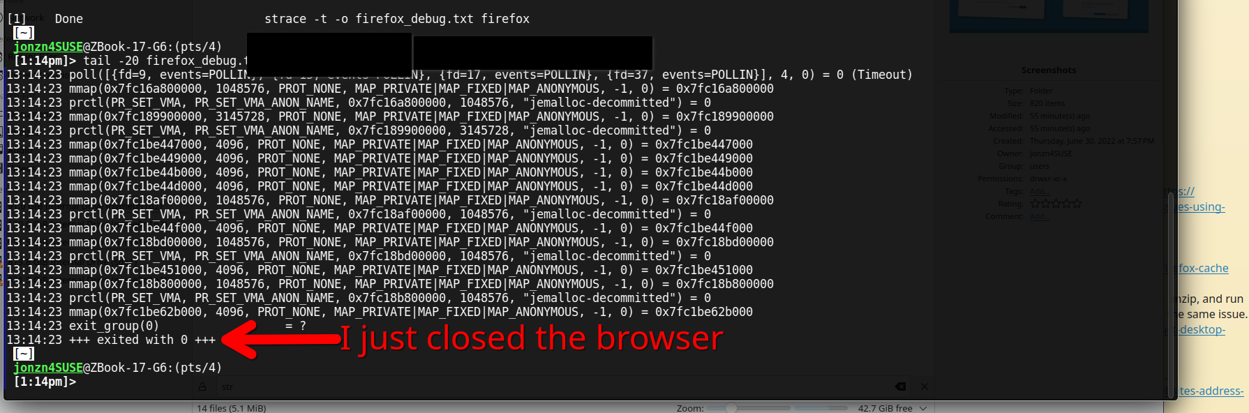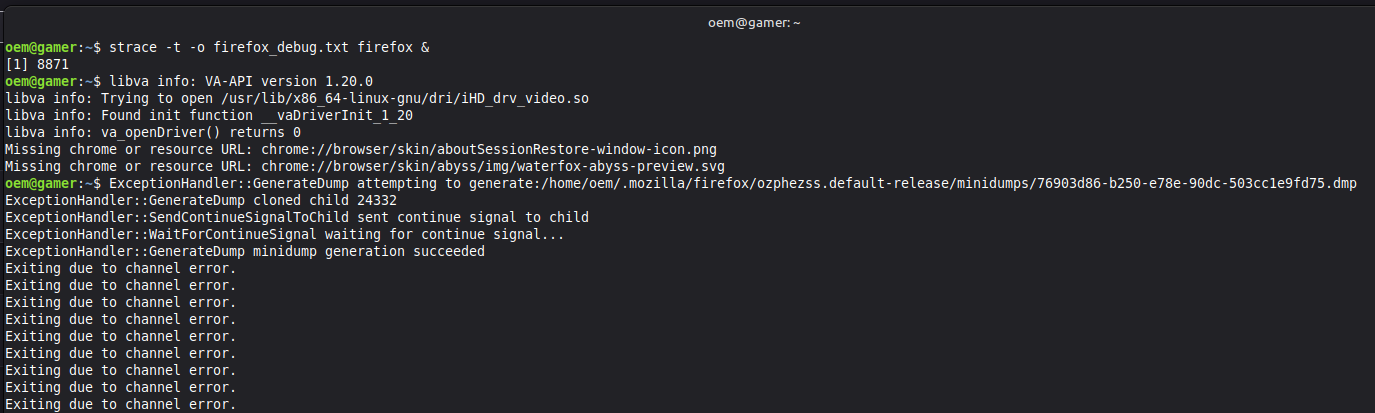 I am currently running firefox from the command line with the strace command, though I admit I may have hit a wall- I think? I will show a screenshot.