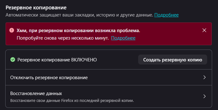 - backup is enabled, but I cannot create one - the error occurs every time - restarting the browser and system did not help