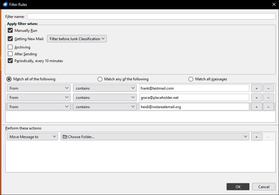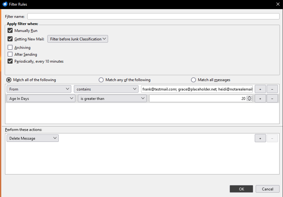 I have a lot of mailing lists, newsletters, and a few notification emails I want to use message filters on. Is there a way to force the message filters to search for more than one email address per line, especially for those that I want to also keep the last 2 weeks or the last 30 days? I am hoping for something as simple as a comma separator, but I have not yet found the solution.