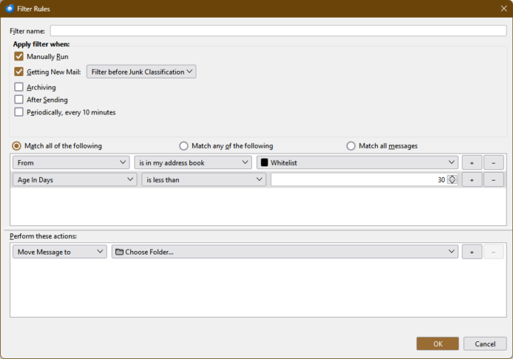 I'd like to do the something and I'm willing to edit the msgFilterRules.dat file but I haven't been able to find a specification/ rules for the condition statement. Is there an API spec somewhere For instance I have the following rule: condition="AND (from,contains,substack.com) AND (age in days,is greater than,3)" That I'd love to have something like condition="AND (OR (AND (from,contains,substack.com), AND (from,contains,medium.com) ) , AND (age in days,is greater than,3) )" Is there a spec or API for the message filter object/ function?