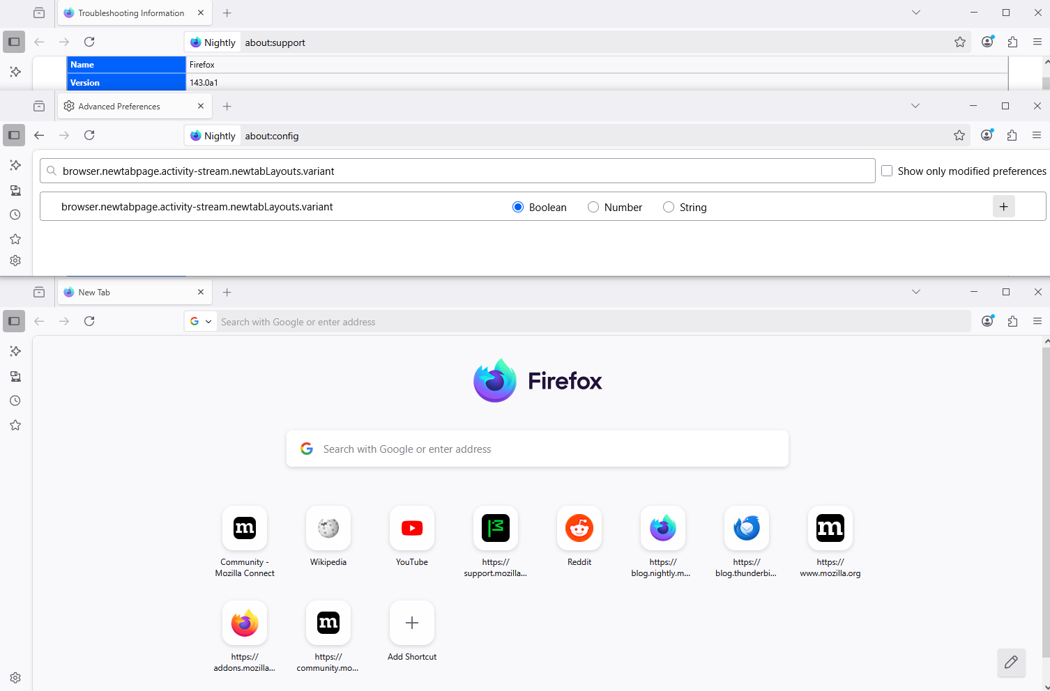 By way of other illustration under Firefox Nightly 143 browser.newtabpage.activity-stream.newtabLayouts.variant, preferences no longer exist.