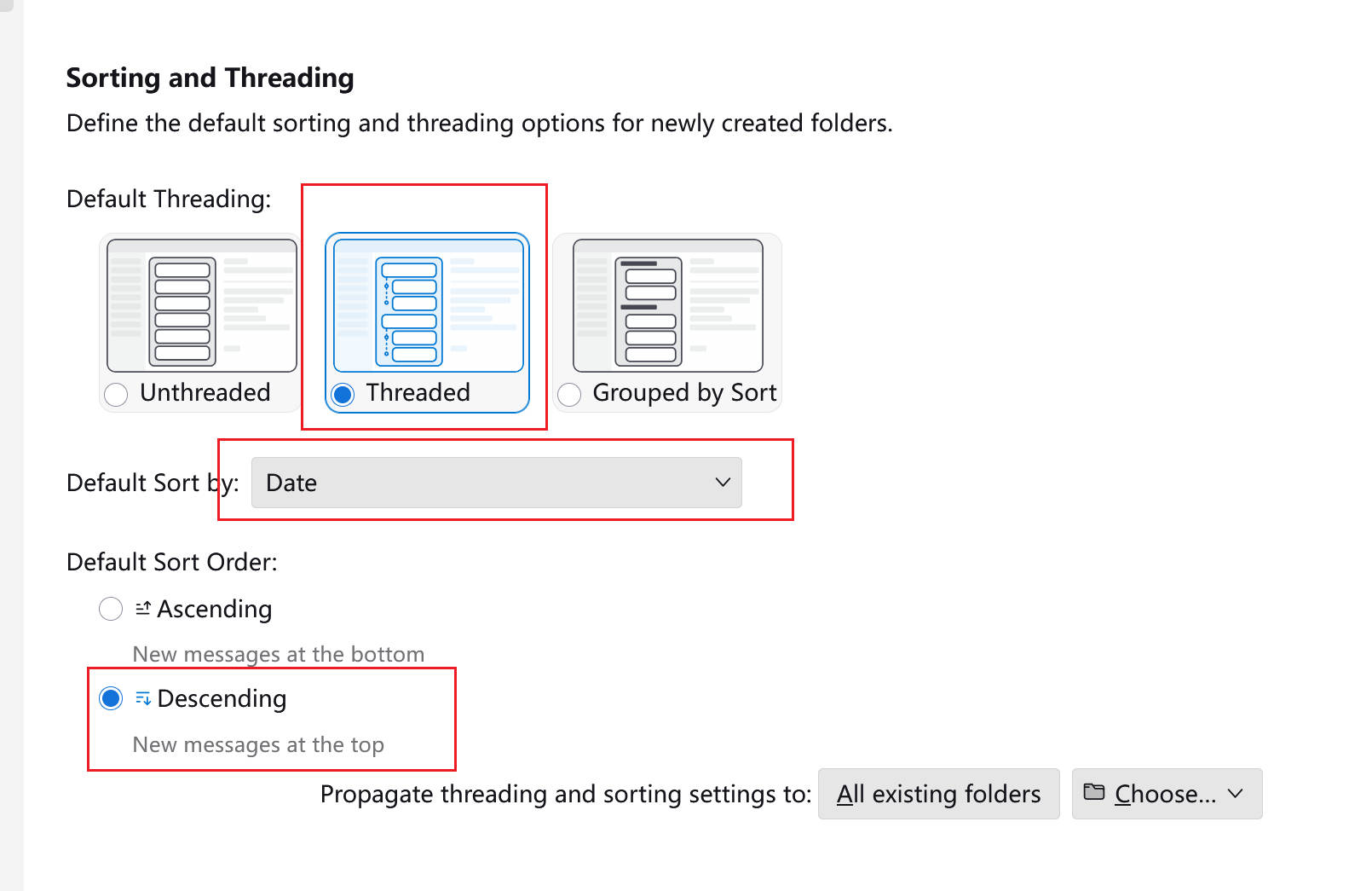 I set the emails to be sorted by Threaded and in descending order by time, but I found that in the main email list, the order of the emails is correct, with the latest email at the front.