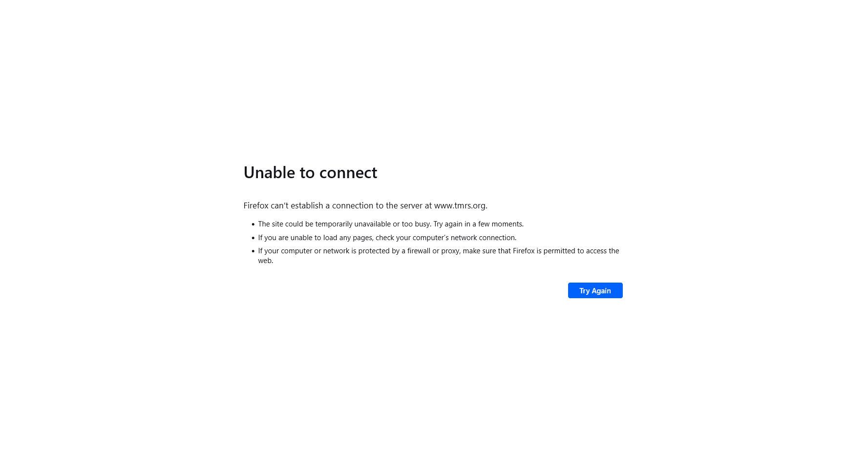 I tried all trouble shooting modes listed in help and reported a possible broken site. None fixed my problem so I reset Firefox and still get the following message when I try to log into my tmrs.com; Unable to connect Firefox can’t establish a connection to the server at www.tmrs.org.