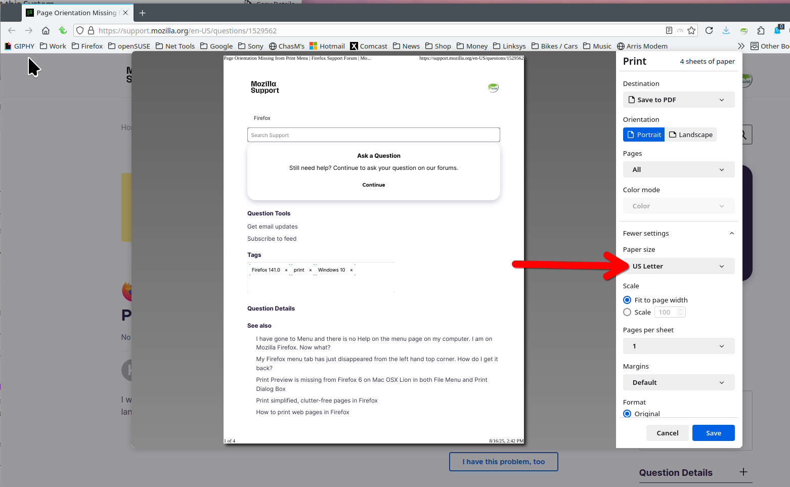 I want to Print something from the internet in letter format but the menu to select is missing. It's defaulting to landscape.