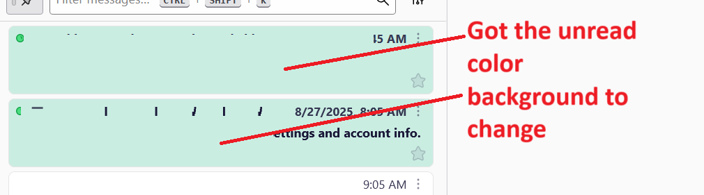 1 changes the unread message BG color. 1 changes the header panel to dark grey shown in image. 1 changes the background color or read messages to a slightly darker grey: