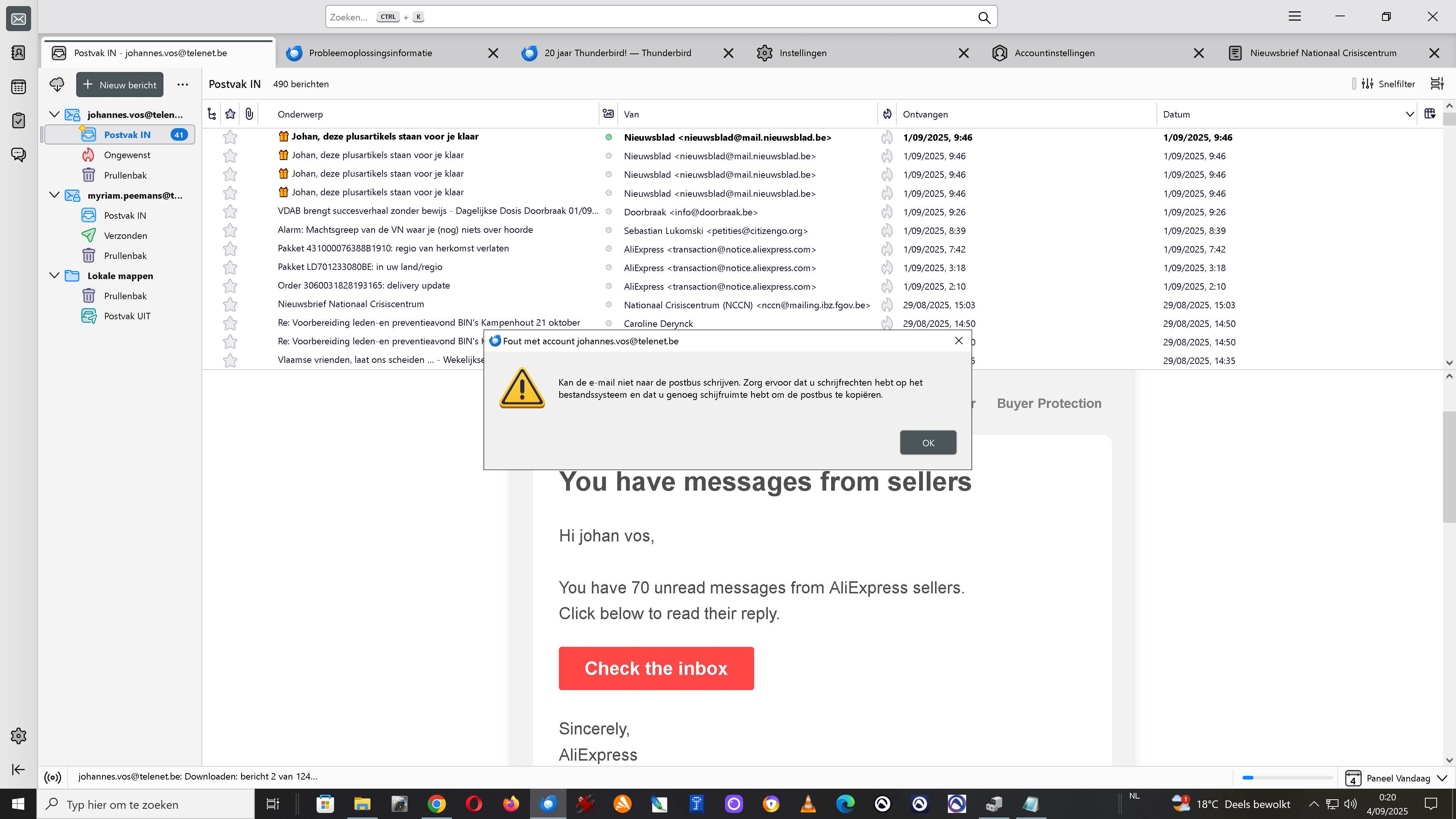 since last update yesterday Thunderbird can't retrieve e-mails from provider. Gives a message that "can't write the e-mail to your mailbox. don't have the rights to write or not enough space" looked at that but has the right to write and enough space on the drive. Have now installed Outlook and that works fine and writes to the same drive Contacted the provider and nothing changed by them. What went wrong since this update? kind regards Johannes Vos **privacygevoelige gegevens verwijderd**