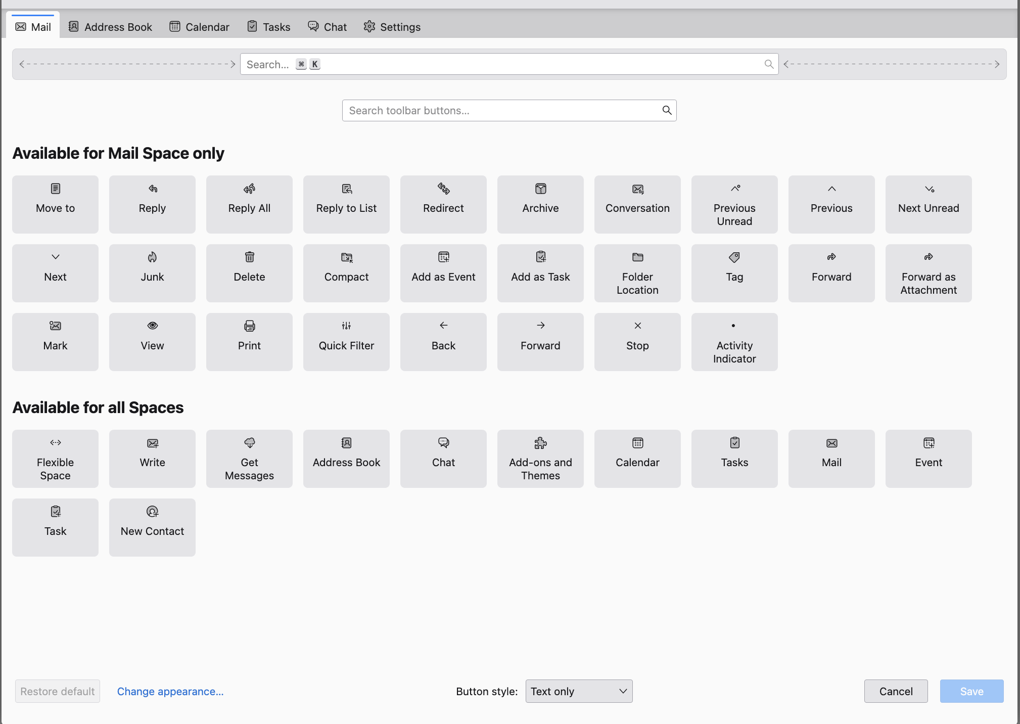 I tried restore (grayed out), edit and save (grayed out), tried all button styles (makes no difference). I tried dragging buttons where I want them - nothing lands and sticks, and couldn't save them if it did.