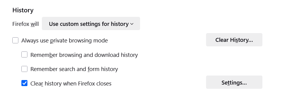1. Go to Settings ▸ Privacy & Security ▸ History. 2. Make sure Firefox will: Use custom settings for history is selected. 3. Then enable Clear history when Firefox closes, and click Settings… next to it. 4. In that dialog, make sure Browsing & Download History is checked as well — not only cookies or cache.