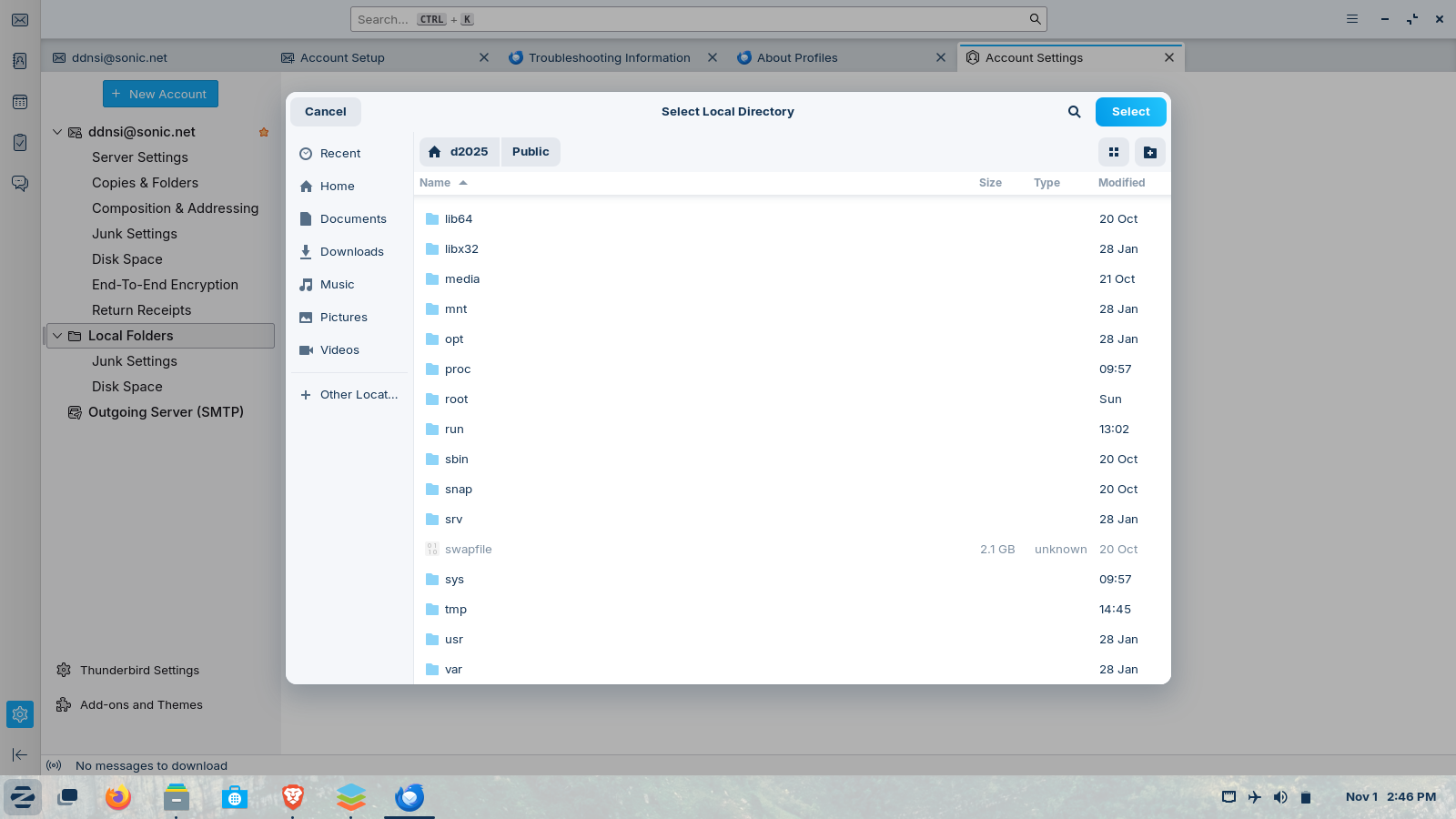 But then when I click "Browse", I assumed it would take me to the location. Instead, it opens up a dialog box that says "Select Local Directory". But nowhere do I see a ".thunderbird" folder. I did select to Show Hidden Folders, but still no luck. See 2nd screenshot.
