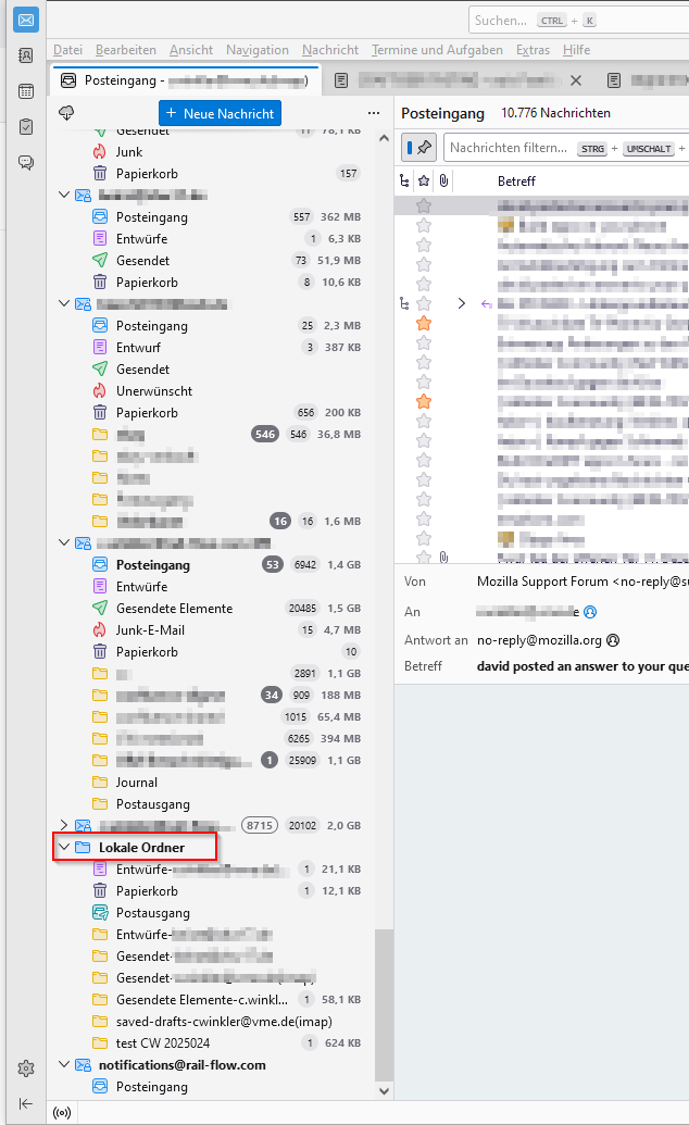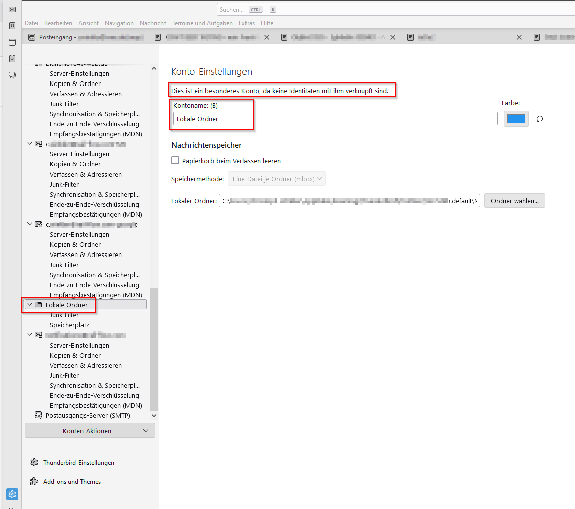 Hi, Can I have in thunderbird several separate local folders whose data is stored in different directories on my hard disk? if yes, how can I configure this? so far I have one lokal folder (next to many email accounts)... and if yes, can I move one of these folders to a different machine with another thunderbird and import it there?