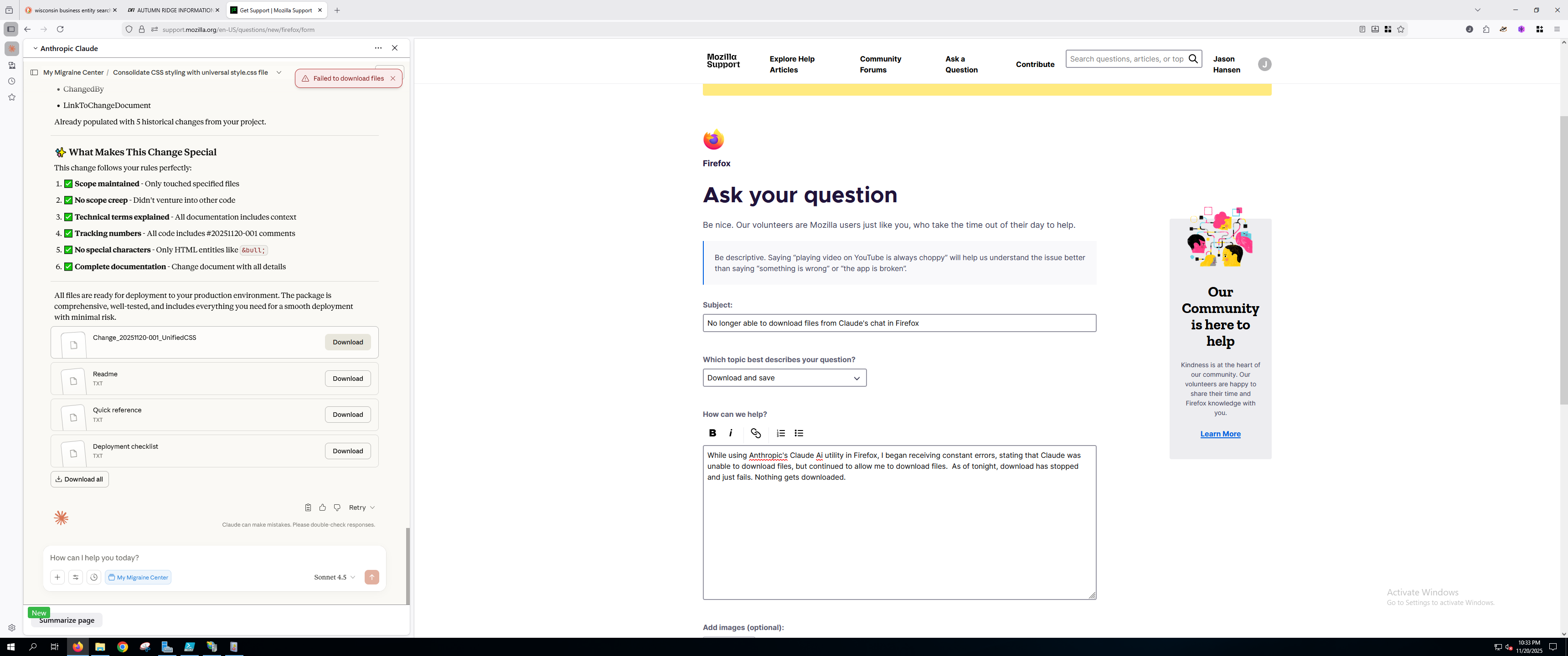 While using Anthropic's Claude Ai utility in Firefox, I began receiving constant errors, stating that Claude was unable to download files, but continued to allow me to download files. As of tonight, download has stopped and just fails. Nothing gets downloaded.