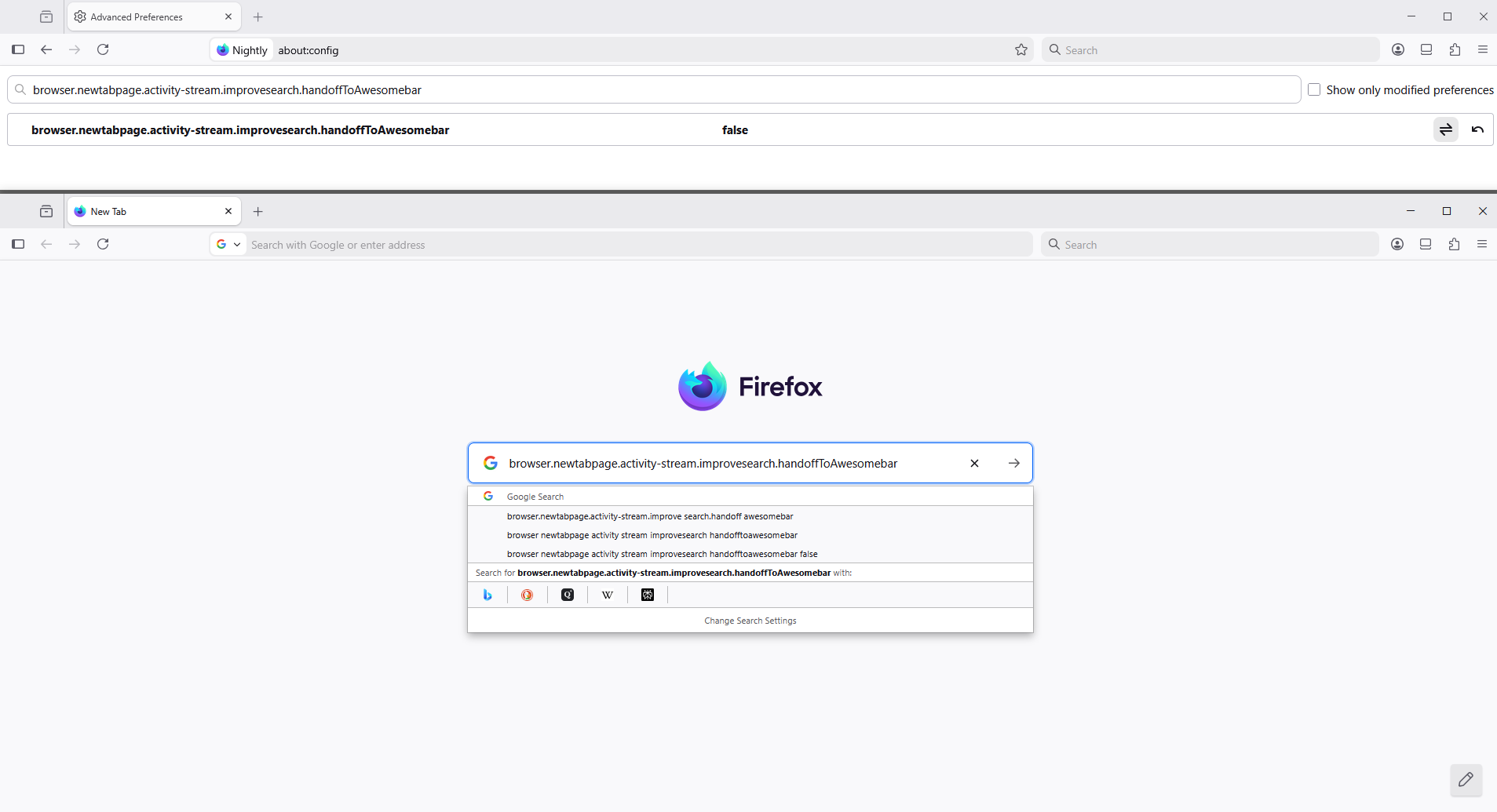 Other subject. Is it, about, browser.newtabpage.activity-stream.improvesearch.handoffToAwesomebar. https://connect.mozilla.org/t5/ideas/please-use-the-searchbox-but-not-the-address-bar-in-new-tabs/idi-p/4720 You can try. 1 - Go to configuration editor for Firefox https://support.mozilla.org/en-US/kb/about-config-editor-firefox 2 - Enter a search term browser.newtabpage.activity-stream.improvesearch.handoffToAwesomebar Double-click on the preference, to set its value to false