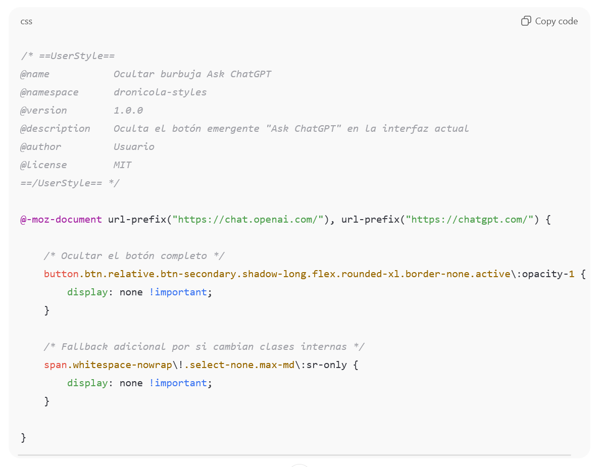 I am experiencing an unwanted UI behavior in Firefox. When I select text on any webpage, Firefox displays a floating “Ask ChatGPT” bubble above the selected text. This happens regardless of the site. I want to disable this feature, but Firefox provides no setting or preference to do so.