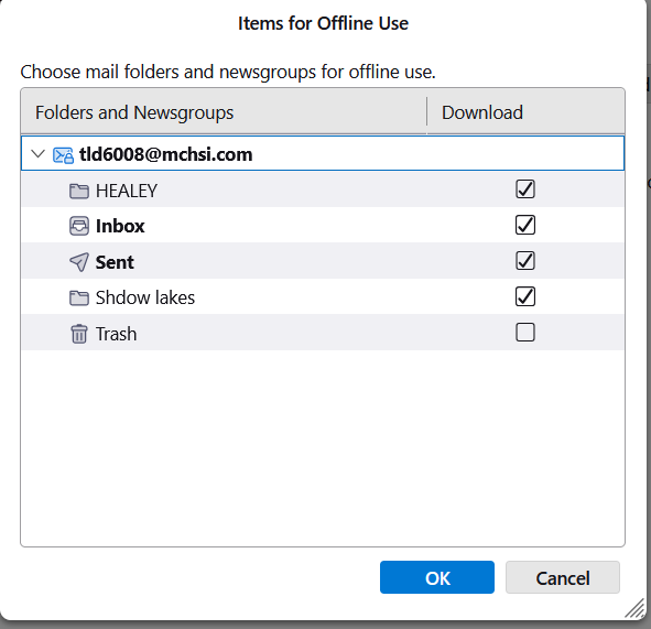 - Check the new account. Does it look like my last screen image? Does it have all the IMAP server folders that it should have? Does it have the folders that you created on the server? If not, right click on the account name in the folder pane, select "Subscribe", and check all the folders. Expand the inbox in that list of folders to subscribe to if there are sub-folders of the inbox. Send a test message to yourself. Does it get sent? Received? Saved in the "Sent" folder? Are there connection issues? Do all the folders have the messages in them that they have on the server? If there are problems, check the settings that Thunderbird found against the settings that Mediacom says are needed (see attached image).
