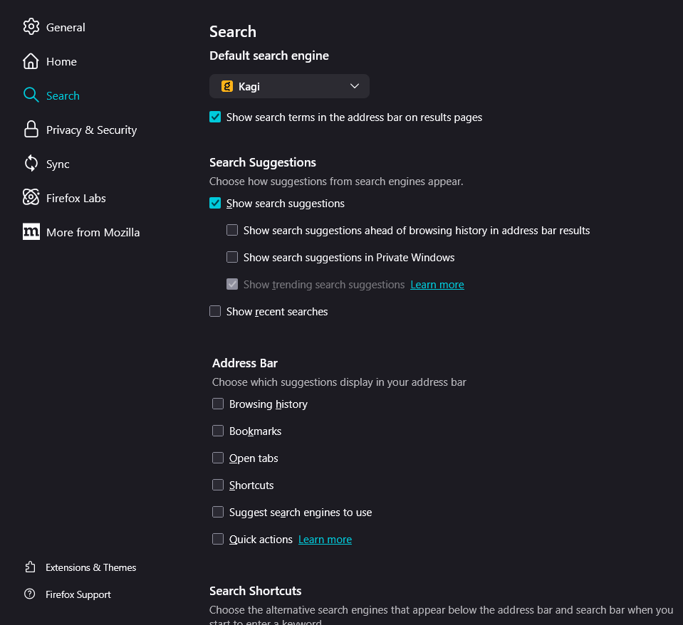 So, I configured the suggestions in the search bar so that nothing from my history/previous searches is displayed (see attached image with current settings). However, suggestions from my past searches still continue to appear. I would like only the autocomplete suggestions from my search engine to appear (I'm using Kagi). I already tried to delete my browsing history (Crtl + Shift + Delete - Everything, browsing and download history), it deleted everything but my past searches... Can somebody help me? Thanks! attachments: (search suggestions settings, search suggestions appearing now)