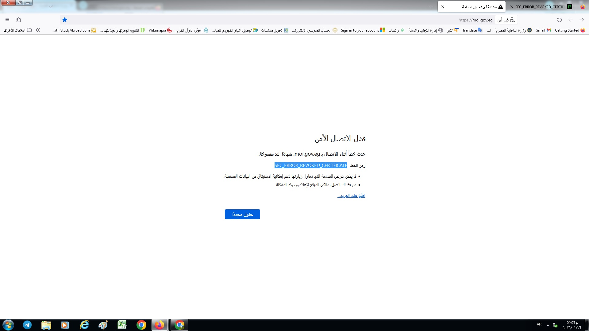 حدث خطأ أثناء الاتصال ب moi.gov.eg. شهادة الند مفسوخة.
