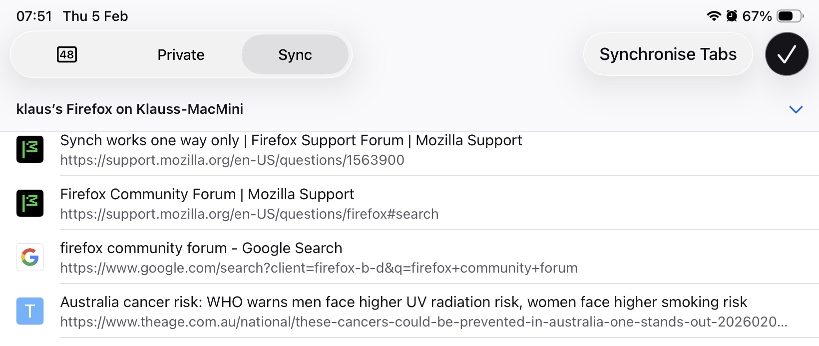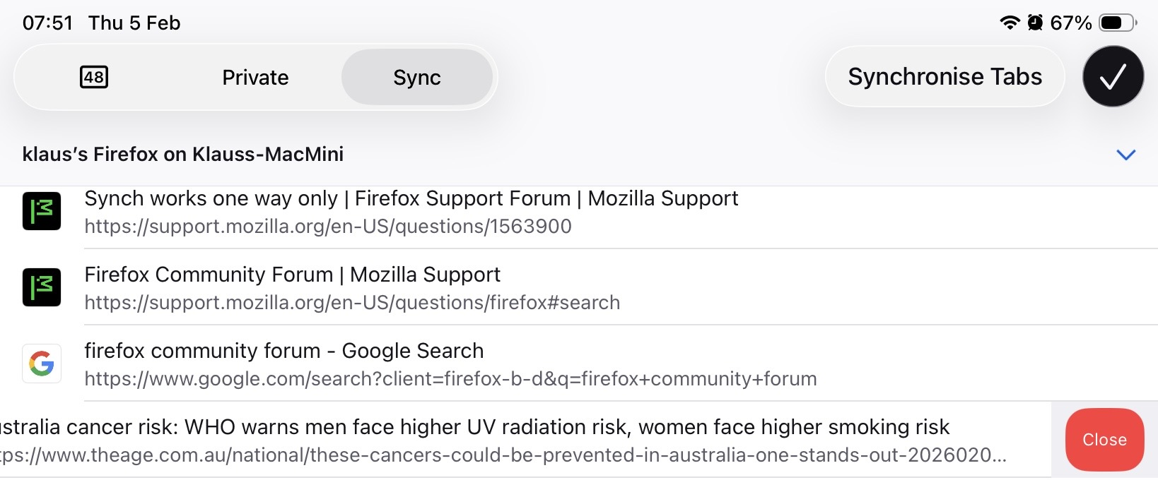 Hi, I am using Firefox on Mac Os Tahoe and IOS 18.7 and 26.2 (2 iPads). I have set up synching of my open tabs, but this works only from MacOs to the iPads, not the other way round. When closing MacOs Firefox tabs on the iPads this does not synch back to the Mac. I am missing something?