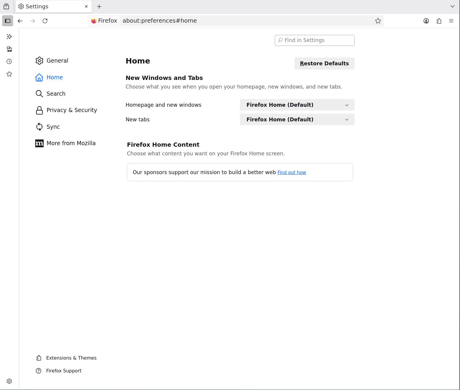 I am switching from firefox to firefox-esr. Version 147.0.3 to 140.7.0esr, start firefox with --allow-downgrade which mostly works. What does not is the "Home default" page, it is blank and can not even be configured to what it was because the settings page is also blank, nothing below "choose what content ...".