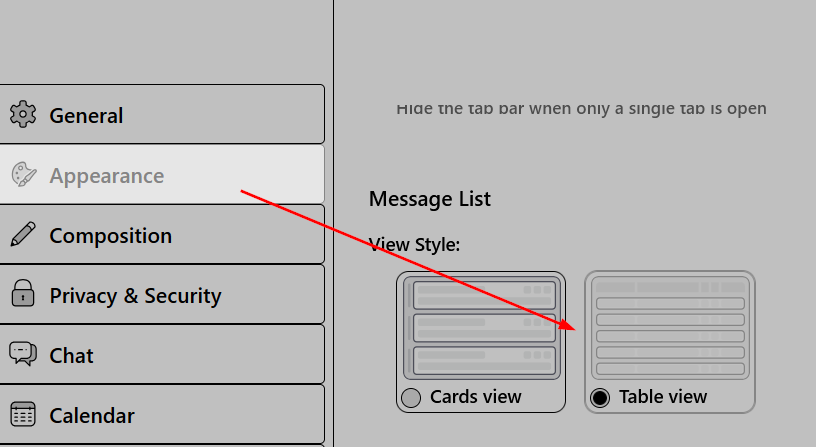Go to TB menu > Appearance > Message List and choose Table View.