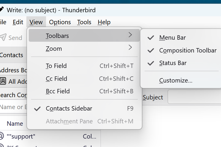 I have a new Windows 11 computer and installed Thunderbird. Whenever I try to insert an image there is no option to do so. I was able to do this on my Windows 10 machine but not on this new Windows 11 machine. I went into settings and in the Composition section, under Sending Format, I did have it set to Automatic but changed it to Only HTML. In the Write message, in the Options menu, there is no insert image or anything. On my Windows 10 machine, there was an Insert for images and tables etc. On my Windows 11 machine, none of those options are available. How can they be missing? I don't want to send my image as an attachment, I want to insert it to the body of the message.
