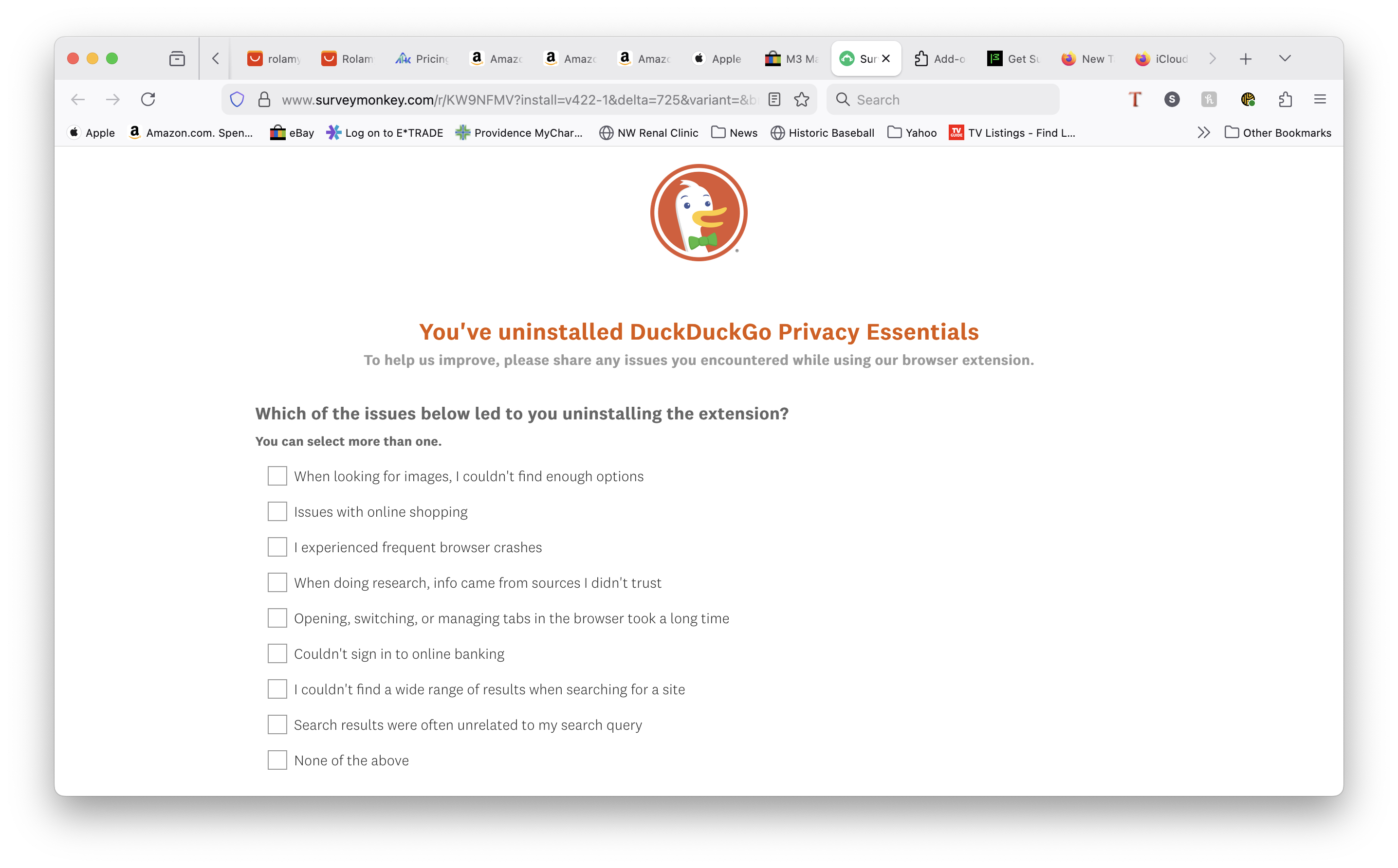 Several extensions were recently deleted without my input. Among them were Duck Duck Go Privacy Essentials, Keeper Password Manager, and Apple's iCloud Password autofill. I know there were others, but I cannot even recall which ones they were. Not sure if this happened after the most recent update or later, but it happened at some point in the last 24 hours given that today is 3-15-2026 12:30 pm PST. I only discovered this when a tab popped up in Firefox asking me to complete a survey as to why I uninstalled Duck Duck Go Privacy Essentials, which in fact I NEVER did. See attached pic. Nor did I uninstall any of the aforementioned, et. al. Thanks Mozilla for f'ing up my settings and overall browsing experience across all of my devices without my consent.