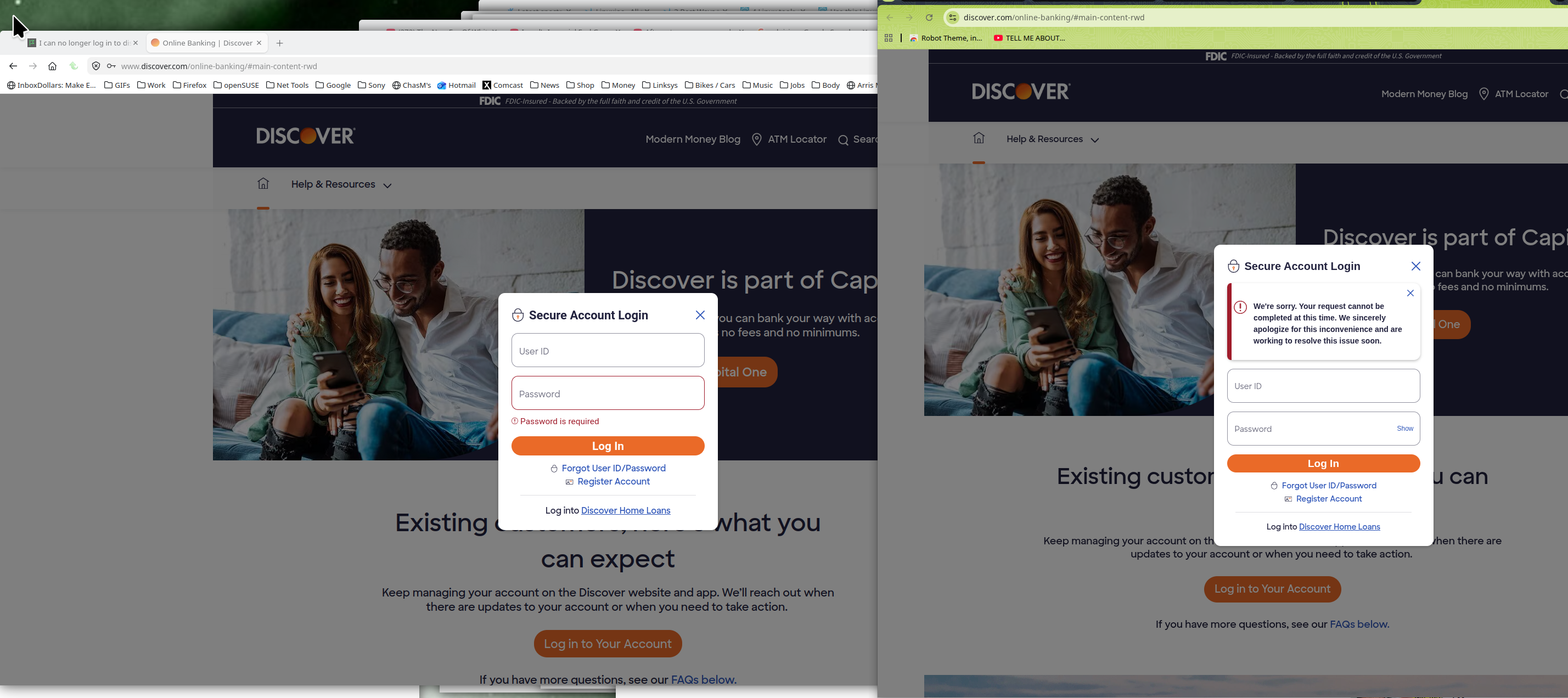 Hello, I am using Linux Mint on a desktop with the latest version of Firefox. Two weeks ago I could login to the Discover website with no problems. Suddenly I can not log in, but get an error message that something is wrong and I can't login. I can login using Chrome on this machine. My wife gets the same message when she tried to login to her account on my computer. After several discussions with Discover, all I get is "it is not our problem."
