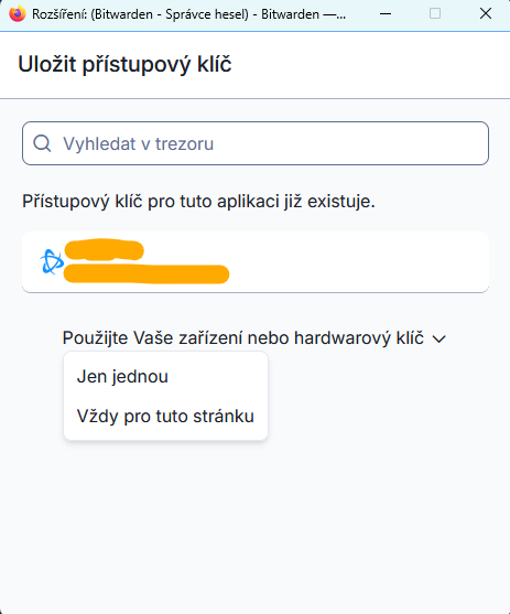 What happened: 1) I wanted to create a Passkey for a website and store it in Bitwarden. 2) Bitwarden pop-up opened, but while exploring the options, I accidentally clicked on the option "Use your device or hardware key: Always for this website". 3) Windows Defender dialog popped up with the options "iPhone, iPad or Android device" and "Security key" 4) I backed out of the dialog window 5) I clicked the button to create a Passkey again but going forward only the Windows Defender pop-up appears The problem: I now cannot create a Passkey to store in Bitwarden on a specific website, because I accidentally clicked on "Use your device or hardware key: Always for this website". What I've tried that didn't work: - looking through Bitwarden settings - deleting Firefox cookies - doing the same thing in Private Browsing - asking AI and looking through about:config, about:preferences and about:logins, as well as trying to find profile files related to webauth Found workaround: - creating the Passkey from a different Mozilla profile I would still very much like to be able to undo the "Always for this website". Is there a way to do that? (Attached images were captured later when recreating the situation.)