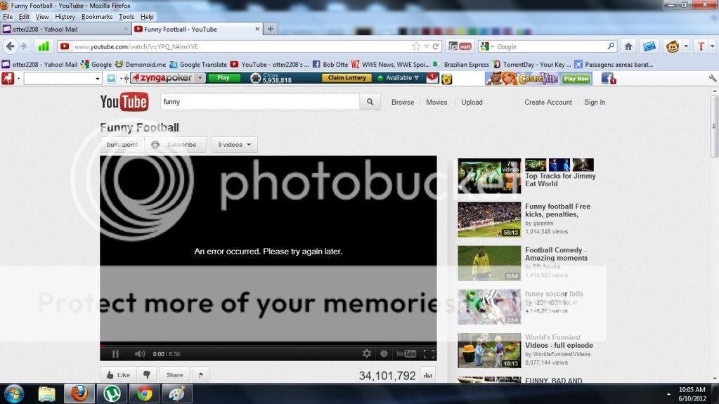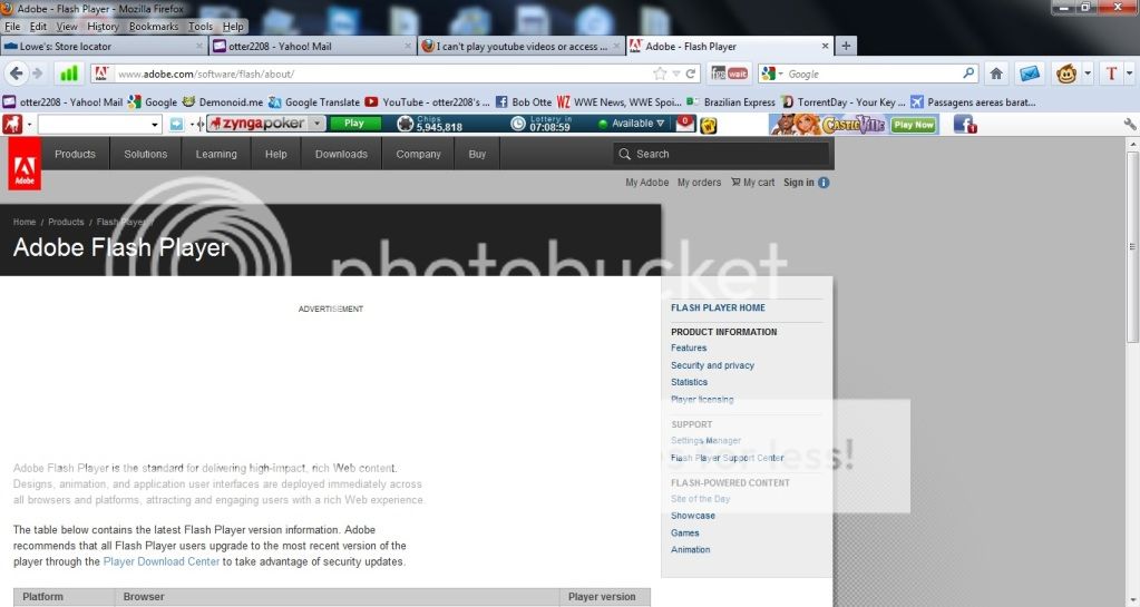 I can't play youtube videos or access games on facebook, and some websites I only get 1/2 the page. It seems like something is blocking my flash. It says my flash is up to date and also shockwave. I have included 2 screenshots. I have started in safe mode and nothing works. Works perfect in google chrome. The problem is only firefox. Any ideas??? http://i431.photobucket.com/albums/qq36/otter2208/youtube.jpg http://i431.photobucket.com/albums/qq36/otter2208/face-1.jpg I goto my plugins and see shockwave flash only. Also I have tried other sites with video and the video does not pull up at all.