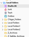 A short while ago, after a recent Thunderbird update, all of my account info disappeared, as well as my local folders. I was able to rebuild my accounts fairly easily, but had to purchase a recovery tool to find my lost emails that had been stored in local folders. I've started sorting them and creating folders inside my mailbox (instead of local folders) to organize emails.