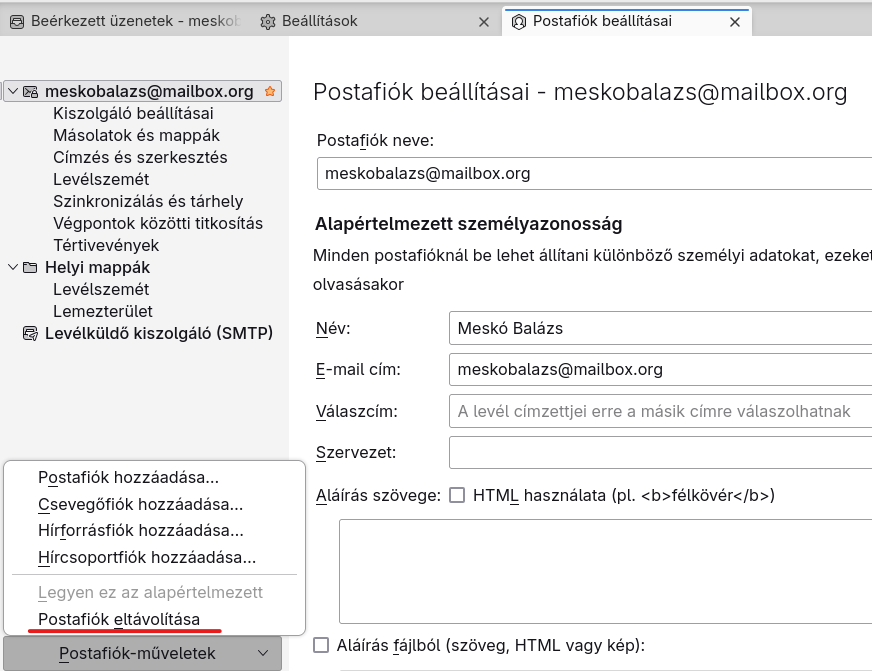 A Szerkesztés -> Postafiók beállításai oldalon lehet eltávolítani a már nem használt fiókokat. A listában válaszd ki a már nem használt fiókot, majd a lenti Postafiók-műveletek gomb megnyomása után válaszd a Postafiók eltávolítása lehetőséget.