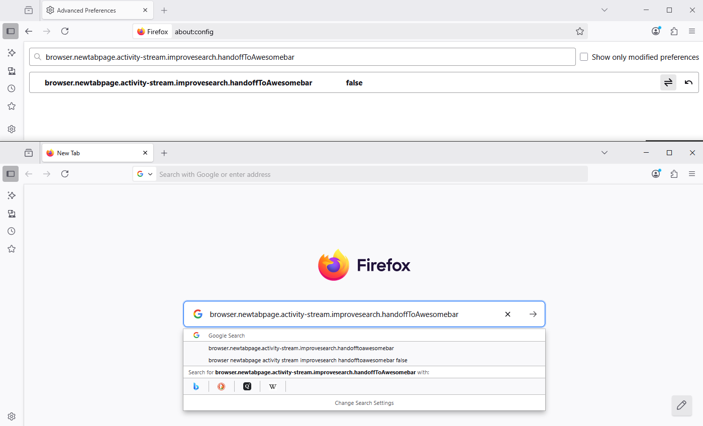 1 - Go to Configuration Editor for Firefox https://support.mozilla.org/en-US/kb/about-config-editor-firefox 2 - Enter a search term browser.newtabpage.activity-stream.improvesearch.handoffToAwesomebar You can double-click on the preference to set the value to false