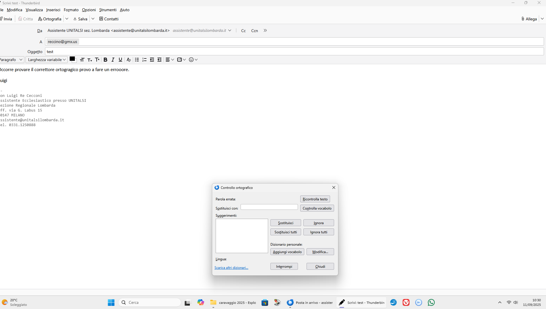 Buongiorno. Segnalo un problema con il correttore ortografico, che si presenta anche in modalità risoluzione problemi. Il correttore ortografico che da mie impostazioni appare e viene eseguito all'invio di ognimessaggio, funziona male. Segnala errore ma nessun termine viene indicato: la casella in bianco. Posso indicare ignora 10 volte di fila, ma tutto resta come è. Per superare l'empasse, devo chiudere il correttore e allora la email viene indicata. In sintesi: nella finestra del correttore non vengono mostrati gli errori, nè appare il tasto invia, ne si può proseguire se non interrompendo. Idee? Mozilla Thunderbird 140.2.1esr (32 bit) su Win11.