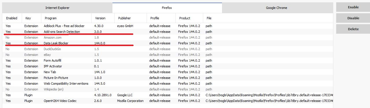 whenever I do a Firefox update, there sometimes is a new extension included that I personally feel no use or need for..most of the time I can disable them w/programs like Ccleaner (see image), but some are persistent, and return the next time I open Firefox. Firefox always consumed a significant portion of my 8gigs of RAM, and my latest update to 144.02, it is approaching 15%. Any way I can stop this short of reverting back to previous version?