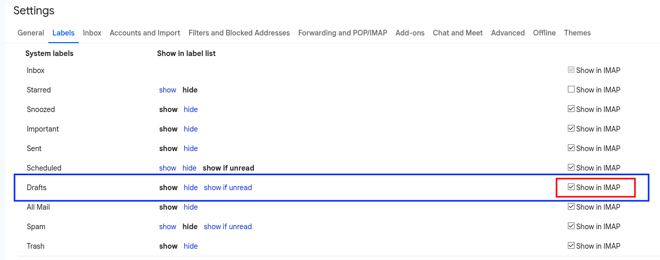 2. If your webmail doesn't have a 'Draft' special folder, try creating a folder or label named 'draft' and enable it to show in imap.