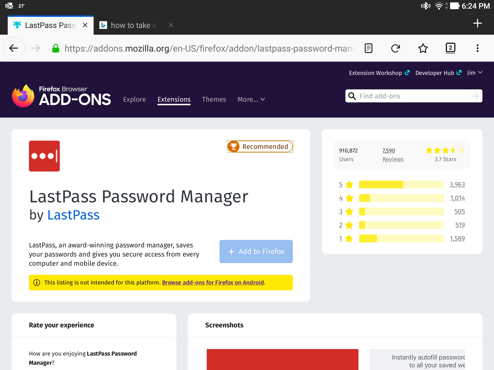 Using an ASUS ZenPad 3S 10 running Andriod 7.0. The add-on I am attempting to install is LastPass. If I choose Help in Firefox I am taken to the support website and cannot determine my version of Firefox. Any ideas?