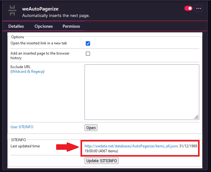 Al parecer tengo un problema con las fechas en mi navegador. Esto ha ocasionado que el complemento weAutoPagerize haya dejado de funcionar adecuadamente. Dicho complemento se conecta con una base de datos para actualizarse. El problema, como indica la imagen adjunta, es que mi navegador le indica al complemento que la fecha es 31/12/1969, lo que conlleva que no se pueda actualizar.