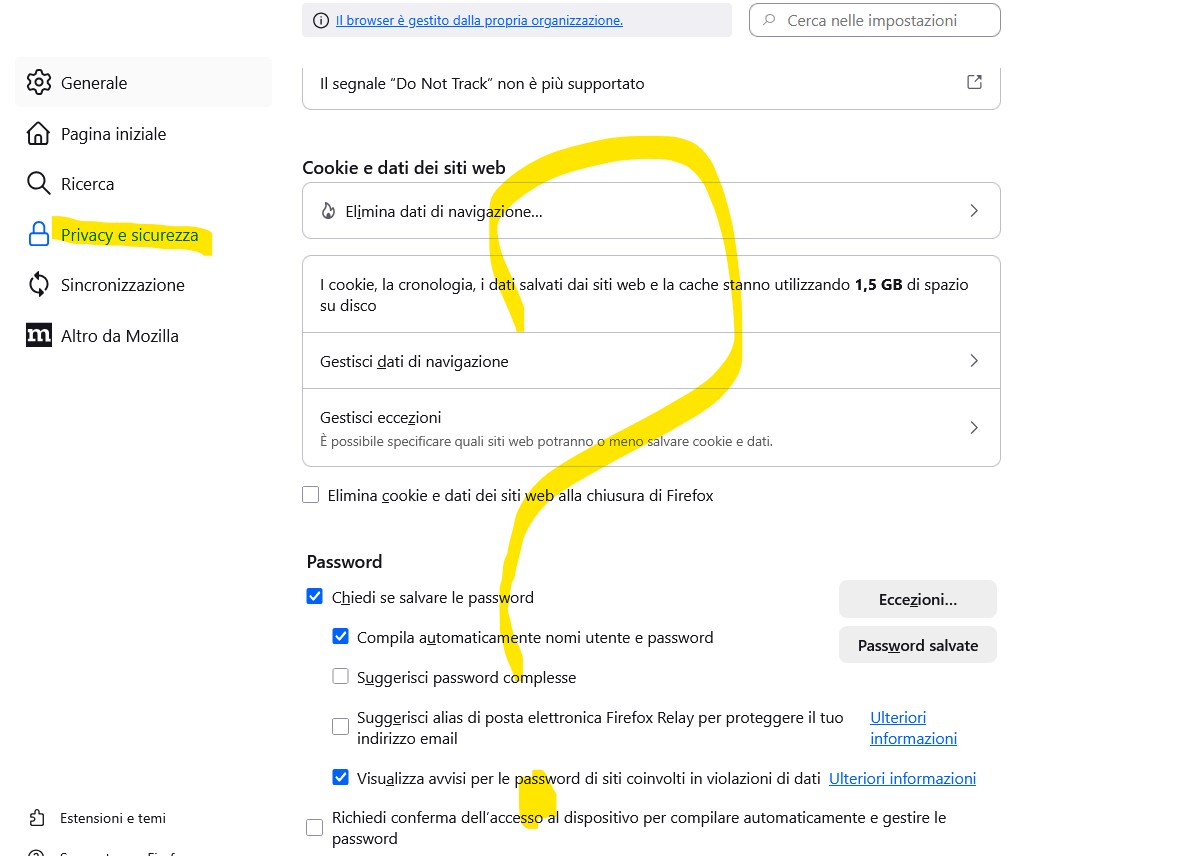 Nel tuo caso vedo nello screenshot che "Il browser è gestito dalla propria organizzazione" -> https://support.mozilla.org/it/kb/messaggio-firefox-browser-gestito-organizzazione per cui sono state sicuramente fatte modifiche rilevati al default. Quali e da chi purtroppo io non posso saperlo.