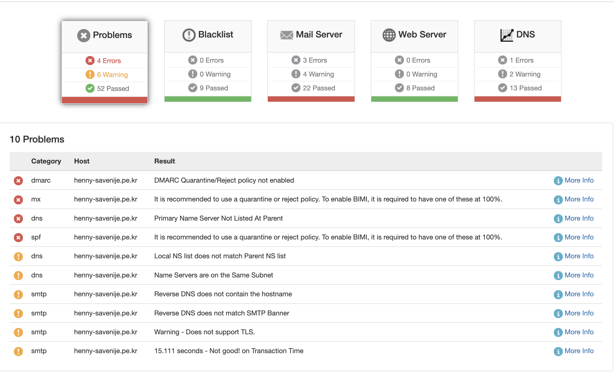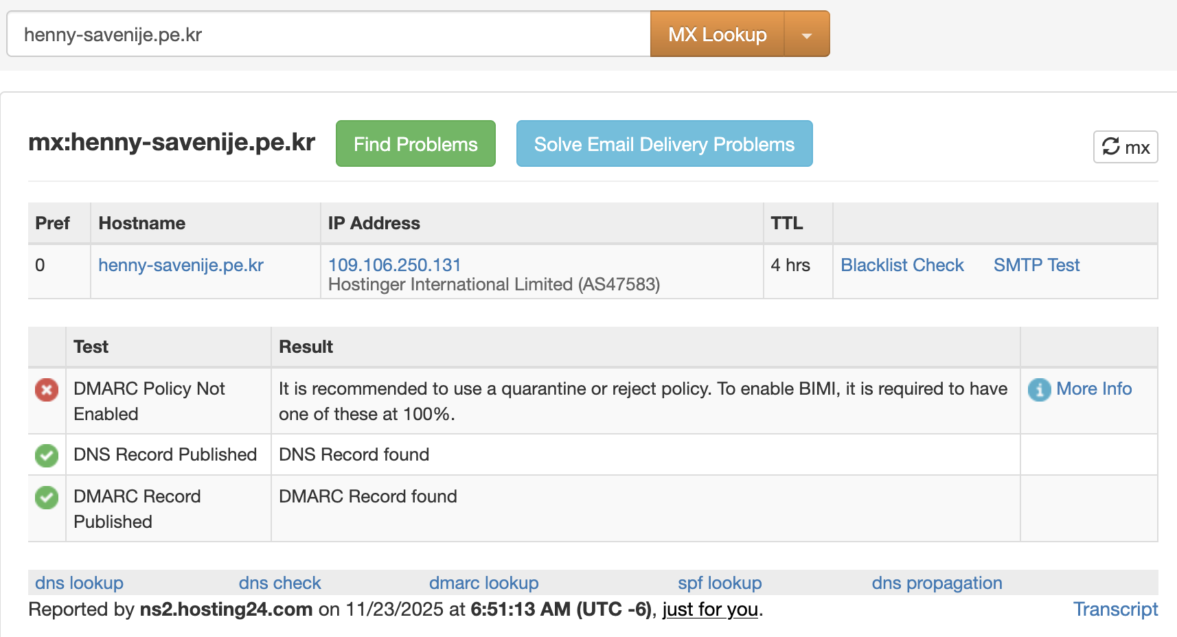 By the way, there seem to be other issues here that you may want to attend to: no DMARC policy is enabled; for SMTP, your password is transmitted insecurely and there is no connection security.