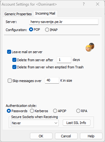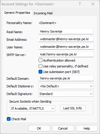 Who hosts your e-mail? Are you hosting it yourself? Your incoming mail server is set to "mail.henny-savenije.pe.kr". Has this been working in Eudora? Most people use a commercial e-mail service provider, where the incoming mail server would be mail.mailbox.org, imap.fastmail.org, or similar.