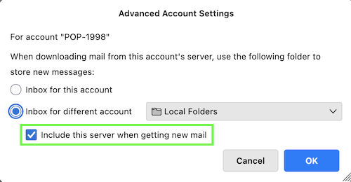 Why "No"? "Inbox for different account > Local folder" is exactly what I suspected and what my first screen shot showed. Did you activate ✔︎ Include this server when getting new mail? Otherwise Thunderbird never will check automatically for new mail in this POP inbox ....