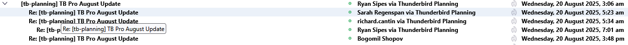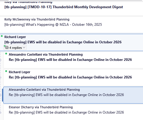 And of course no discussion involving the card view is complete without a link to the user experience discussion from several years ago which demonstrates yet another poor implementation of a threading view on the topicbox website. Comparing what was suggested there to what was delivered is in itself enlightening but their attempt at threading makes Thunderbird look positively wonderful. https://thunderbird.topicbox.com/groups/ux/Tdb49a4666565e68e/cards-view-ui-plans