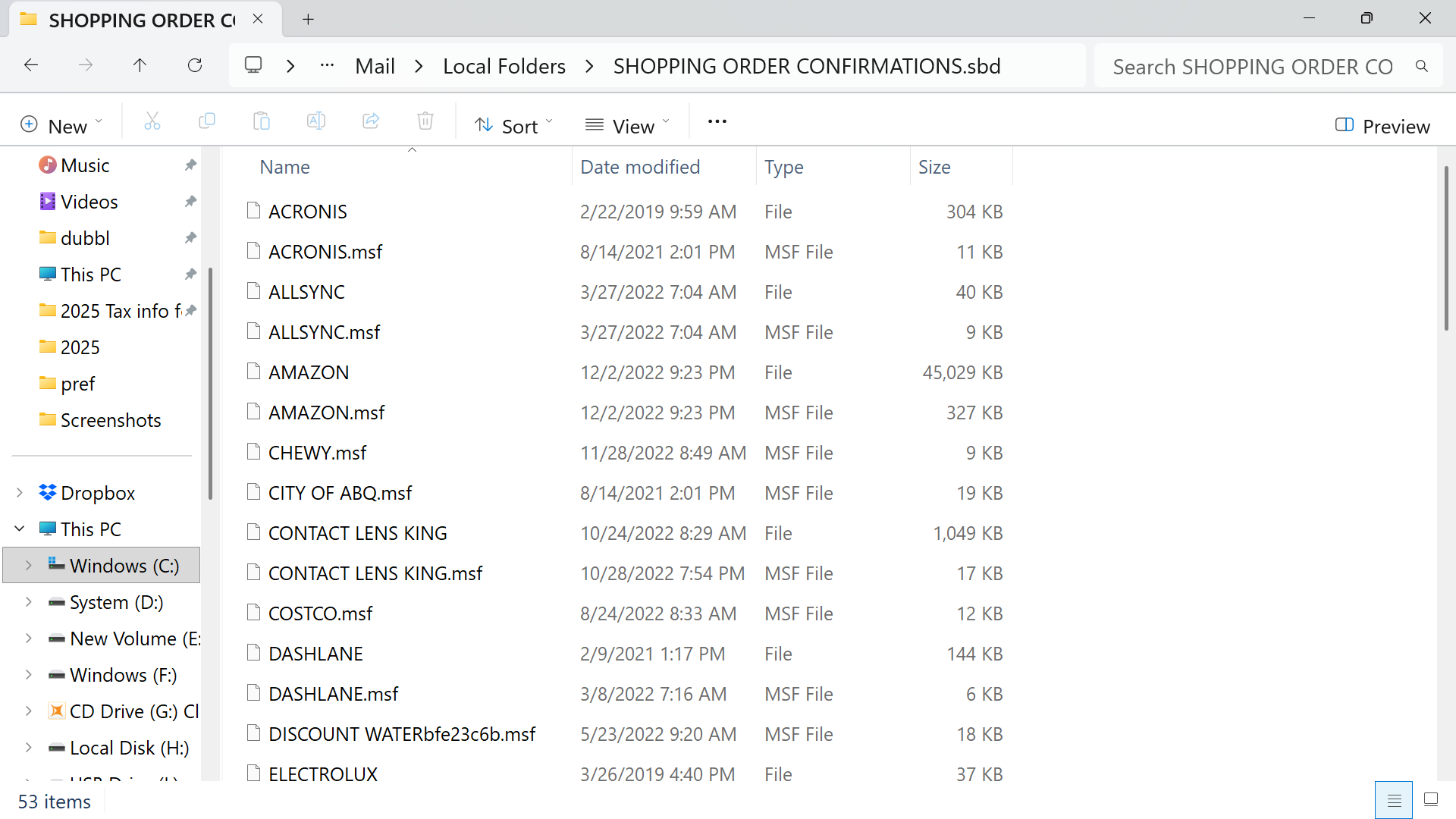 I have included that here...the contents of the shopping order confirmations folder.....do I have to open it and have the individual folders there for Thunderbird to grab on to?....and if so....do I have to move them in to the "shopping order" folder again....or make that folder over?