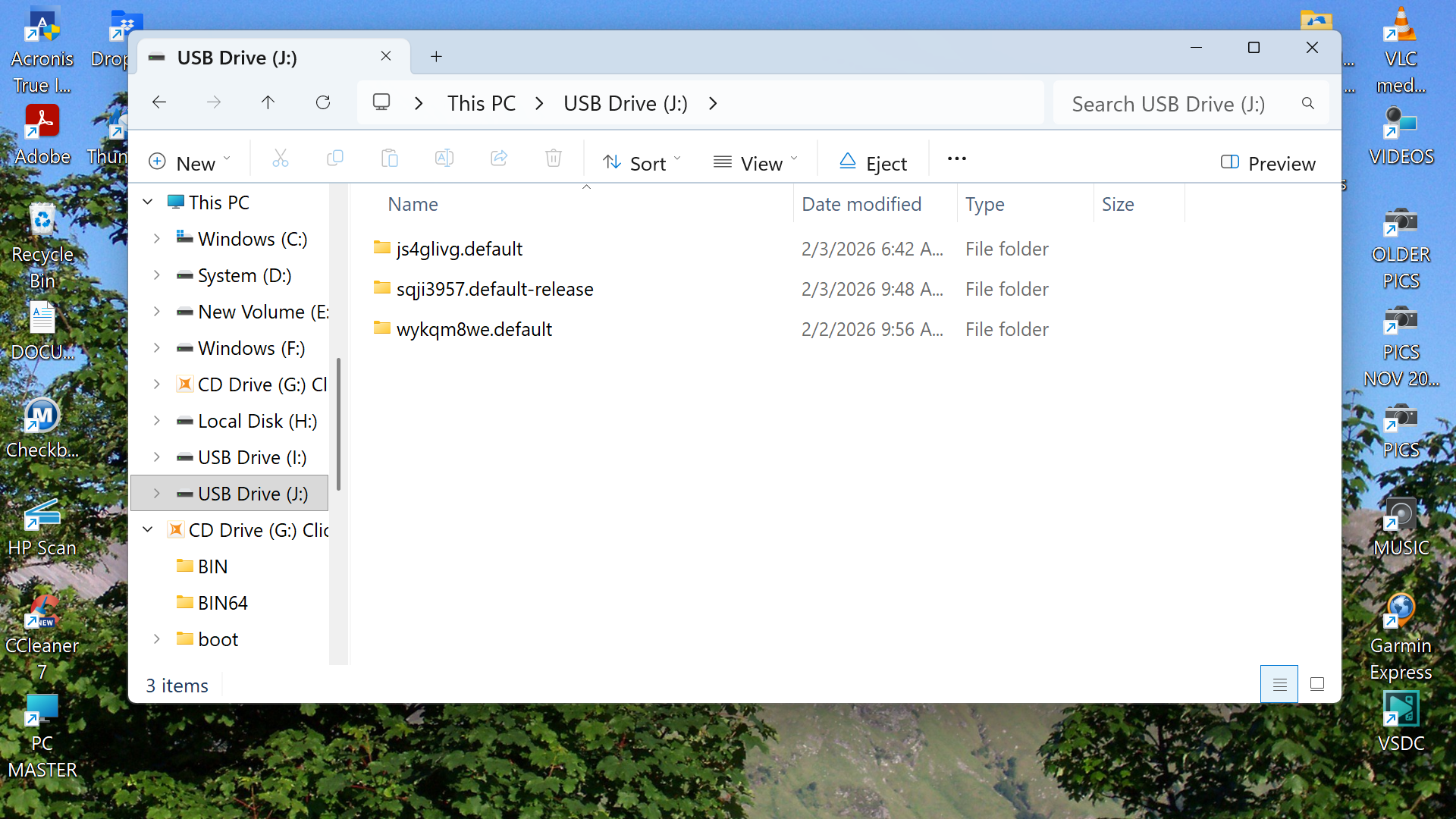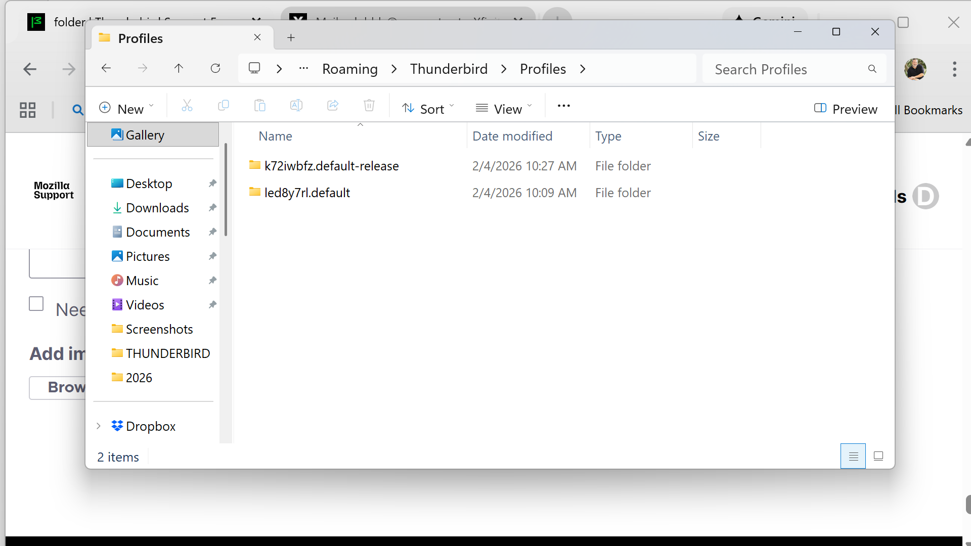 Yes, if that is all the profiles. Next, delete the thunderbird folder itself. On reinstall, Thunderbird will create a new Thunderbird folder. Click through the folders on flash drive to locate the missing files and note where they are located. After you setup email, they can be added back. Post back when you're ready to continue.