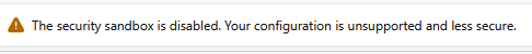 Also have a new error message at the top of the browser that says: "The security sandbox is disabled. Your configuration is unsupported and less secure." (image attached)