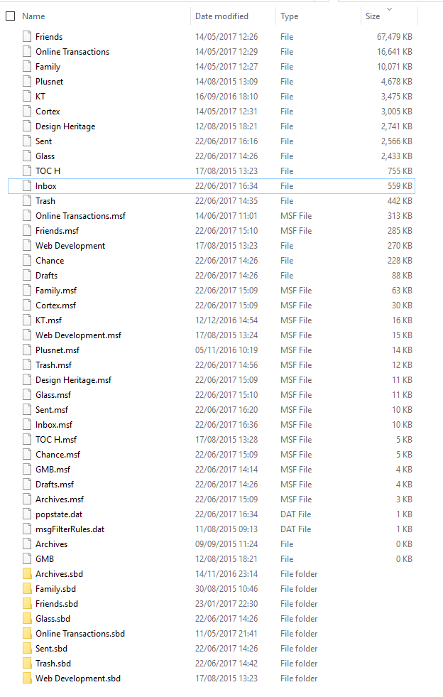 The 'Inbox' mbox file (no extension) is the one that contains emails and you can open those files using a text editor program like 'Wordpad' or 'Notepad'.