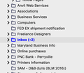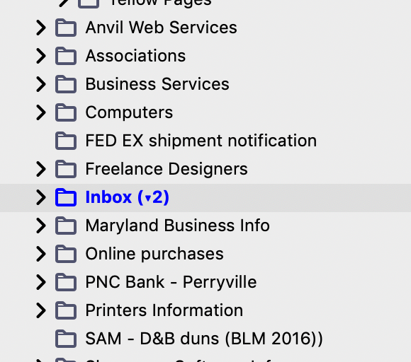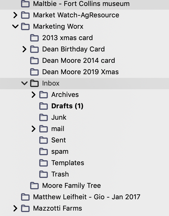The imap mail account folder will contain a 'Marketing Worx.sbd' folder In the 'Marketing Worx.sbd' folder: Additional Check: There should be no 'Inbox' (no extension) mbox file nor 'Inbox.msf' file nor 'Inbox.sbd' folder in the 'Marketing Worx.sbd' folder. If you see any of those files or folders within the 'Marketing Worx.sbd' folder, you need to delete them.